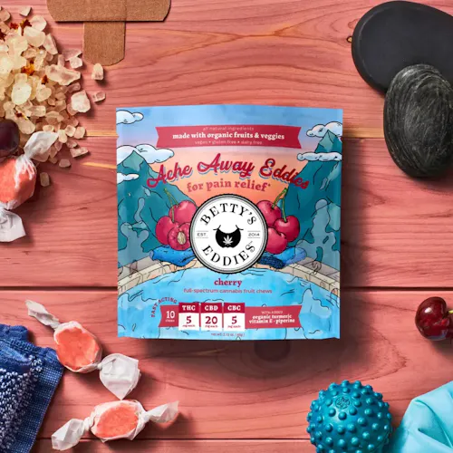 Our very cherry Ache Away Eddies are infused with a soothing blend of CBD, CBC & THC, plus a natural blend of turmeric, piperine, and vitamin E that may help ease inflammation and aid recovery.