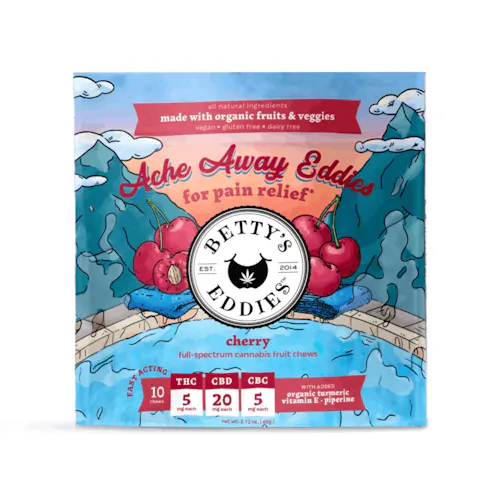 Our very cherry Ache Away Eddies are infused with a soothing blend of CBD, CBC & THC, plus a natural blend of turmeric, piperine, and vitamin E that may help ease inflammation and aid recovery.