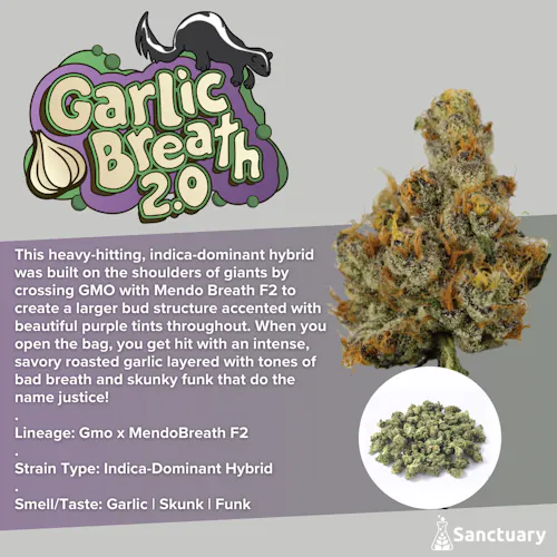 This heavy-hitting, indica-dominant hybrid was built on the shoulders of giants by crossing GMO with Mendo Breath F2 to create a larger bud structure accented with beautiful purple tints throughout. When you open the bag, you get hit with an intense, savory roasted garlic layered with tones of bad breath and skunky funk that do the name justice! . Lineage: Gmo x MendoBreath F2 . Strain Type: Indica - Dominant Hybrid . Smell/Taste: Garlic | Skunk | Funk .