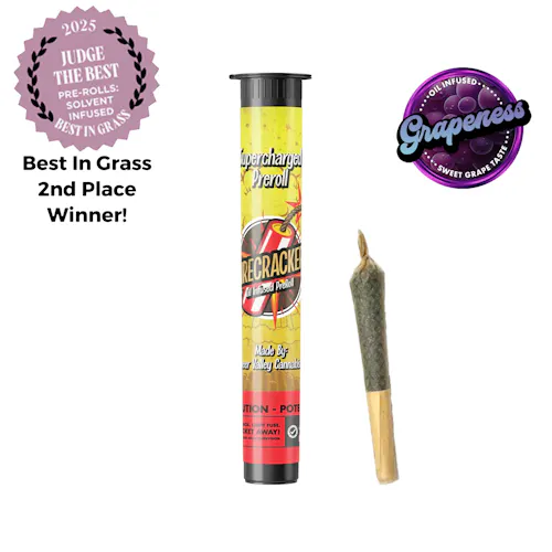 The Firecracker Infused Preroll in Grapeness flavor presents a harmonious fusion of expertise and taste. This creation is skillfully hand-crafted, showcasing an ideal equilibrium of premium flower, kief, and terpene infused distillate. Each preroll contains 0.75g of carefully selected flower and 0.25g of terpene infused distillate, meticulously hand-rolled in a kief blend for added potency and depth of flavor. The Grapeness flavor introduces a rich, fruity undertone, offering an indulgent, grape-inspired twist to the smoking journey. Crafted with integrity, Pioneer Valley Cannabis Co. ensures that their prerolls are exclusively made from full buds, steering clear of trim, to guarantee a pure, unadulterated experience.