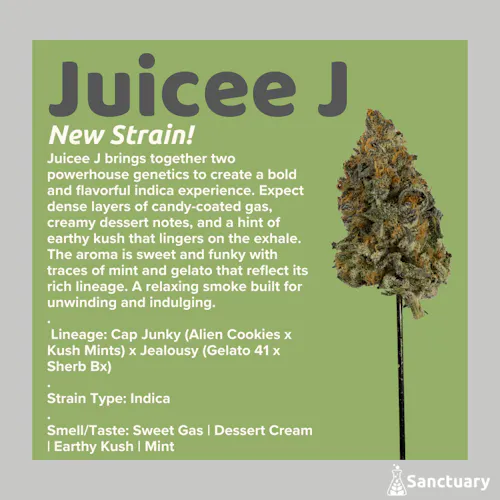 Juicee J brings together two powerhouse genetics to create a bold and flavorful indica experience. Expect dense layers of candy-coated gas, creamy dessert notes, and a hint of earthy kush that lingers on the exhale. The aroma is sweet and funky with traces of mint and gelato that reflect its rich lineage. A relaxing smoke built for unwinding and indulging.
