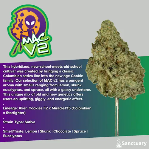 This new-school-meets-old-school cultivar was created by bringing a classic Columbian sativa line into the new age Cookie family. Our selection of MAC v2 has a pungent aroma with smells ranging from lemon, skunk, eucalyptus, and spruce, all with a gassy undertone. This unique mix of old and new genetics offers users an uplifting, giggly, and energetic effect.