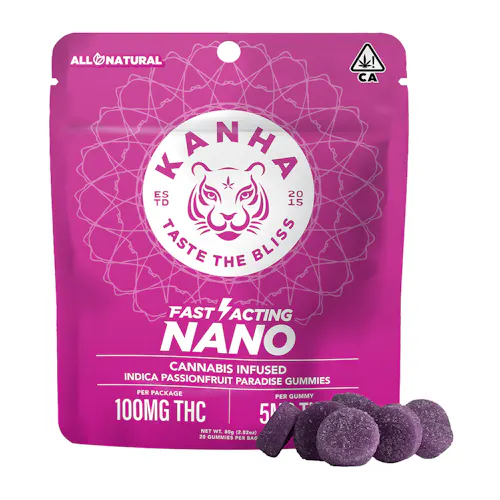 An exotic South American gem, passion fruit tastes like a refreshing wave of tropical goodness. Pairing the tangy citrus flavor with premium indica oil and terpenes like myrcene and a-humulene, Passionfruit Paradise Indica offers better absorption and faster onset times thanks to our exclusive NANO technology. Sold in packages of 20, each gummy contains 5mg of THC, an ideal amount for microdosing or customizing your experience. KANHA, the first to introduce fast-acting effects, remains the industry leader with NANO gummies.