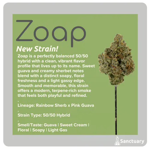 Zoap is a perfectly balanced 50/50 hybrid with a clean, vibrant flavor profile that lives up to its name. Sweet guava and creamy sherbet notes blend with a distinct soapy, floral freshness and a light gassy edge. Smooth and memorable, this strain offers a modern, terpene-rich smoke that feels both playful and refined.